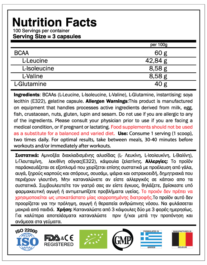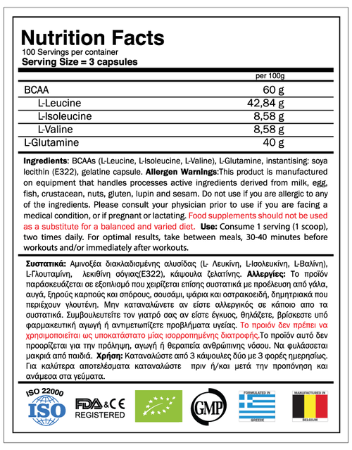 <p><br><strong>Πλεονεκτήματα του extra BCAA</strong><br>• ενεργοποίηση της πρωτεϊνοσύνθεσης<br>• μείωση του καταβολισμού των μυών κατά τη διάρκεια της προπόνηση<br>• διατήρηση και αύξηση της μυϊκής μάζας<br>• μείωση στους πόνους και τις μυϊκές κράμπες, καλύτερη ανάρρωση των μυών.<br>• περισσότερη ενέργεια στην προπόνηση καθώς και βελτίωση των αθλητικών επιδόσεων και της αντοχής</p><p>Χρήση: Για ιδανικά αποτελέσματα καταναλώστε 1 μερίδα (=3κάψουλες) τουλάχιστον 3 φορές την ημέρα.</p>