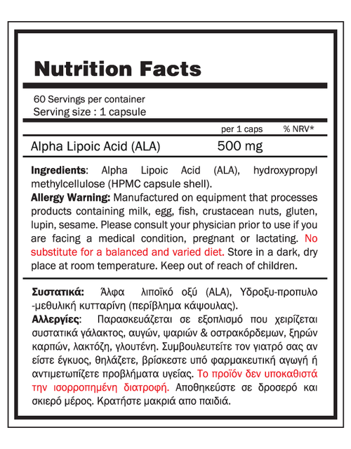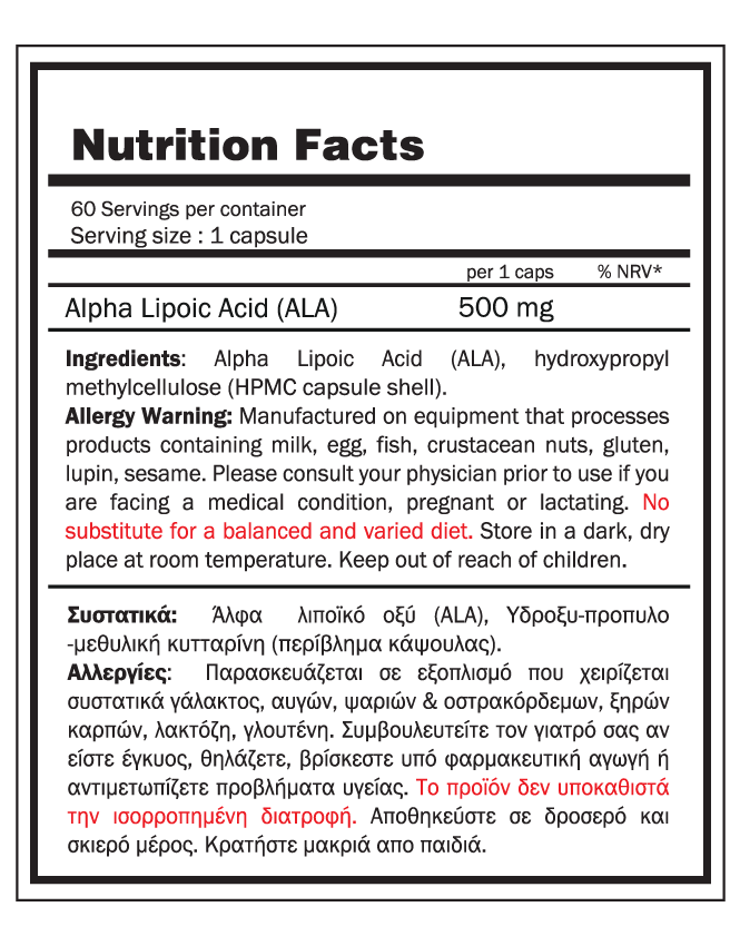 <p>To<b> Άλφα λιποϊκό οξύ (</b><b>ALA</b><b>)</b> είναι ένα λιπαρό οξύ, πρωταρχικός ρόλος του οποίου είναι να μετατρέπει το σάκχαρο του αίματος (γλυκόζη) σε ενέργεια χρησιμοποιώντας οξυγόνο, μια διαδικασία που λέγεται αερόβιος μεταβολισμός. Ως συμπλήρωμα διατροφής, το ALA έχει αντιφλεγμονώδη και αντιοξειδωτική, καθώς αναχαιτίζει τη δράση των ελεύθερων ριζών και προστατεύει τα κύτταρα από τις αρνητικές συνέπειές τους. Το άλφα-λιποϊκό οξύ (ALA) λέγεται και «καθολικό αντιοξειδωτικό» επειδή είναι διαλυτό τόσο στο νερό όσο και στο λίπος, γεγονός που του επιτρέπει να λειτουργεί σε κάθε κύτταρο ή ιστό του σώματος. </p>