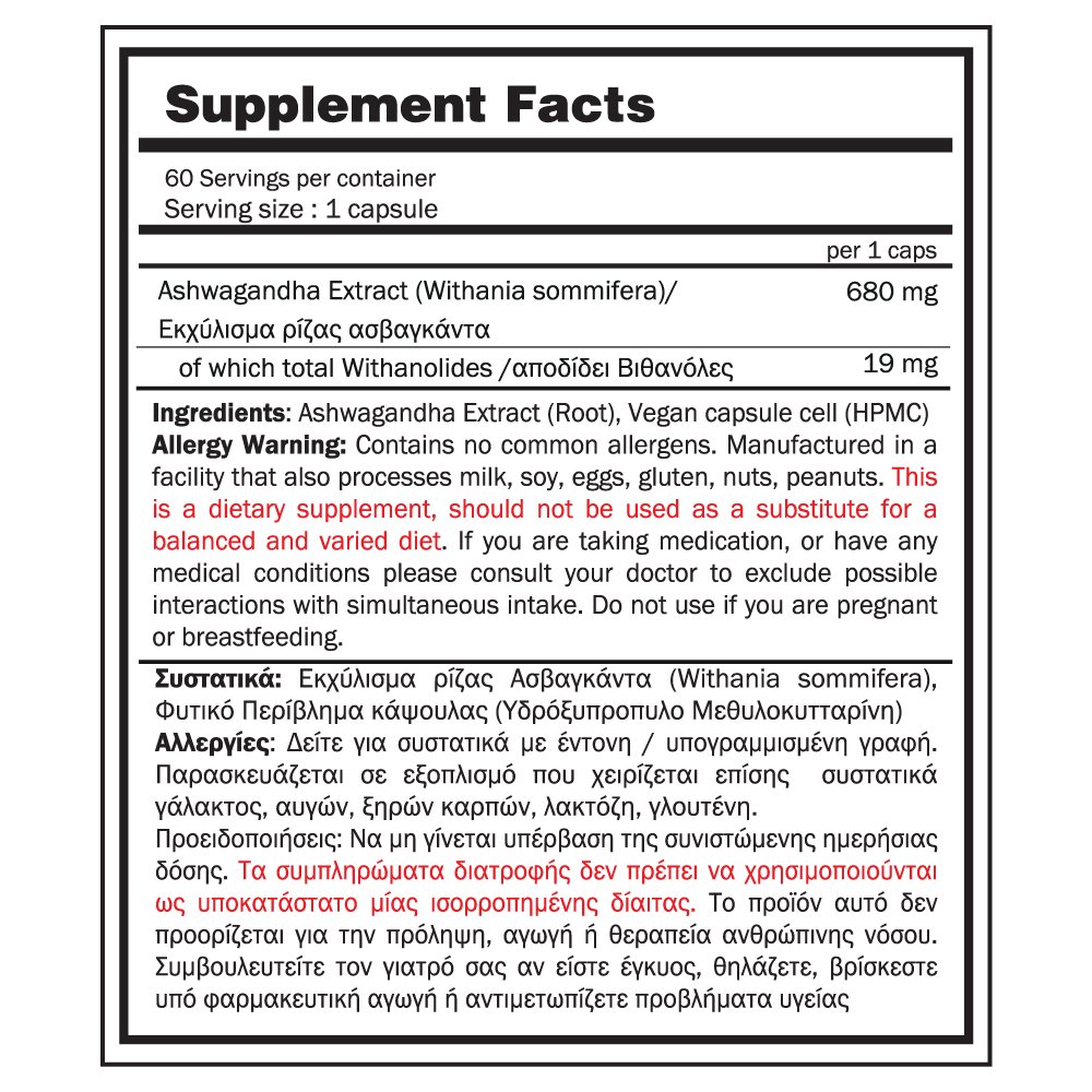 !! Σημαντική Σημείωση: Συμβουλευτείτε τον γιατρό σας πριν από τη χρήση αν έχετε προβλήματα υγείας, ή λαμβάνετε φαρμακευτική αγωγή για να αποκλείσετε πιθανές αλληλεπιδράσεις. H Ashwagandha μπορεί να ενισχύσει τη λειτουργία του ανοσοποιητικού συστήματος. Δεν συνιστάται η χρήση από άτομα με αυτοάνοσα νοσήματα, καθώς μπορεί να τονώσει το ανοσοποιητικό και ενδέχεται να επιδεινώσει τα συμπτώματα.