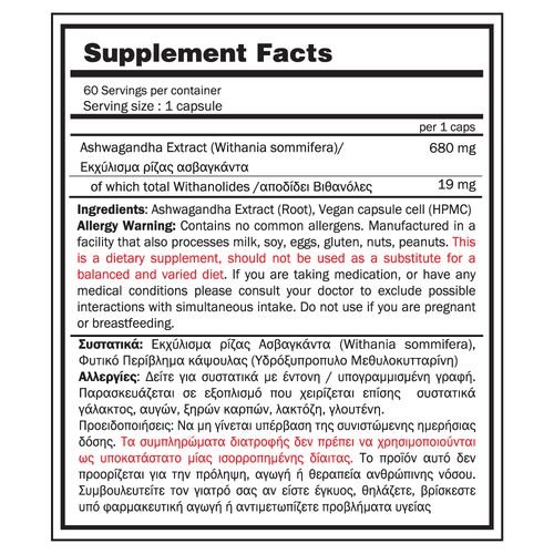 H Ashwagandha (Withania somnifera) είναι ένα φυσικό βότανο με ισχυρή αντιοξειδωτική και προσαρμοσιογόνο δράση, το οποίο χρησιμοποιείται εδώ και αιώνες στην Αγιουρβεδική ιατρική. Η φόρμουλά μας παρέχει 680 mg εκχυλίσματος ρίζας Ashwagandha ανά κάψουλα, τυποποιημένη ώστε να περιέχει 19 mg withanolides, τις κύριες δραστικές ενώσεις του φυτού, για στοχευμένη δράση, στην υποστήριξη της σωματικής και ψυχικής αντοχής.