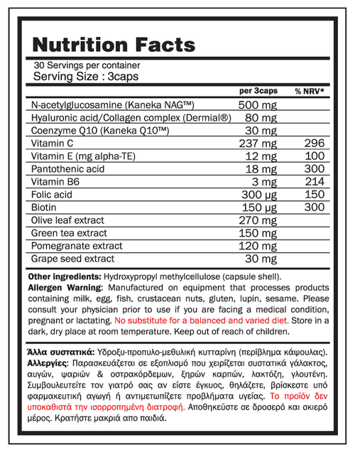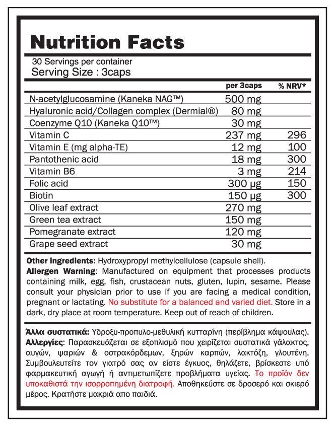 <p>-<strong>γλυκοζαμίνη (Kaneka NAG™)</strong>, εκχυλίσματα ροδιού, πράσινου τσαγιού και φύλλου ελιάς </p>