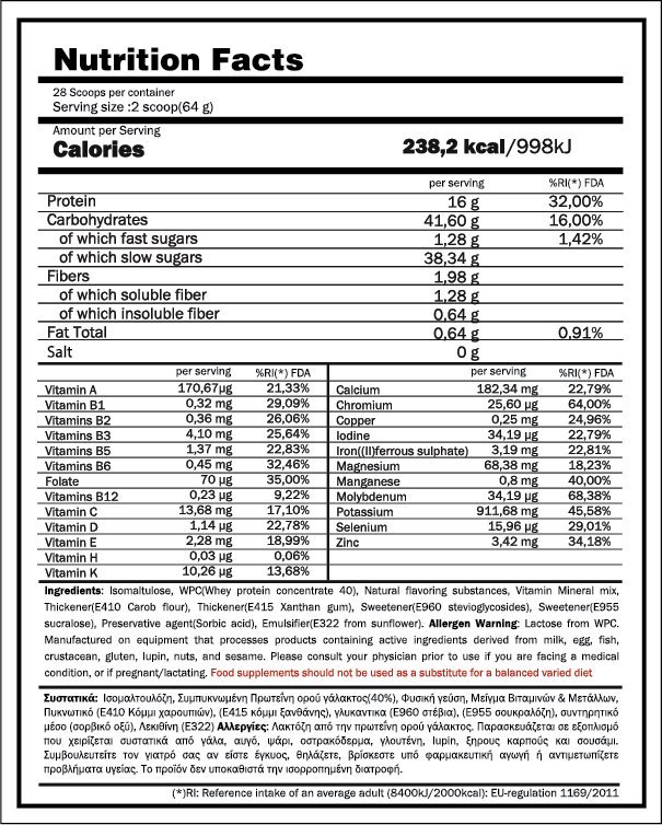 <p>Έχει 25% περιεκτικότητα σε πρωτεΐνη, η οποία είναι 100% WHEY, WPC 83%. Είναι γνωστό πως η WPC είναι μια πολύ καλής ποιότητας, πλήρης πρωτεΐνη, η οποία απορροφάται γρήγορα και απελευθερώνει στον οργανισμό όλα τα αμινοξέα που χρειάζεται για να λειτουργήσει και για να αναπτυχθούν οι μύες. </p>
